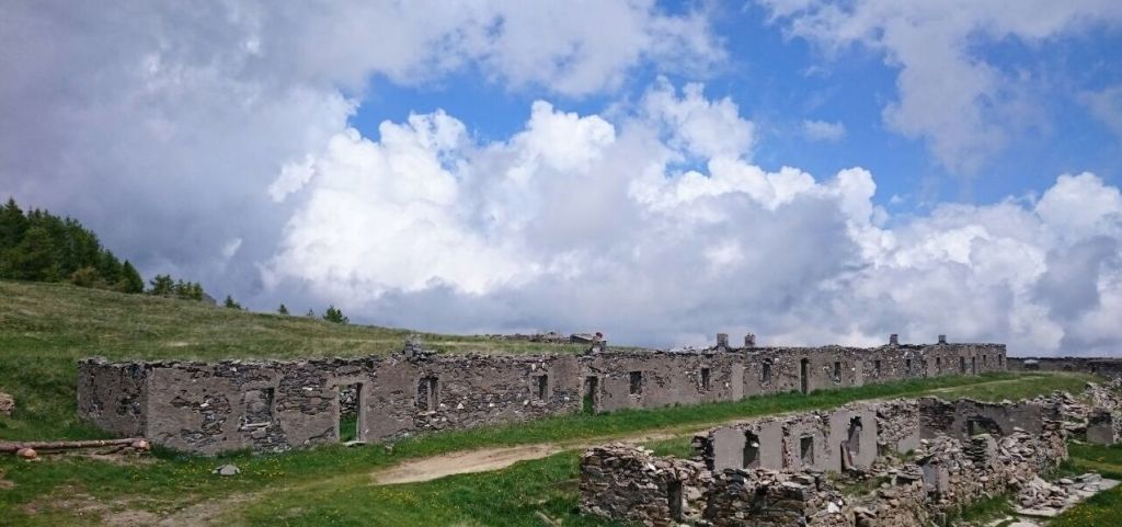 Nach einem letzten Cappuccino am Colle Melosa gehen wir dem Mythos auf den Grund und starten mitten hinein in die mächtige Natur. Auf den ersten Metern sieht das alles noch sehr harmlos aus, wird aber schnell ganz anders. Grobschotterische Stücke mit faustgroßen Steinbrocken, wechseln mit einer Art tiefen Splitbänken ab und frei gespülte Steinplatten kommen zum Vorschein. Die Reifen kämpfen um Traktion und für einen ahnungslosen Nichtenduristen wie mich, ist es grade eine echte Herausforderung. Wobei ich mit der Suzi noch eine sehr gute Wahl meines Gefährtes getroffen habe. Kollege Klaus auf seiner 17 Jahren alten TDM 850 hat aufgrund mangelnder Bodenfreiheit mehr zu kämpfen und Sascha mit der KTM SMT, weiß nun endlich warum breite Reifen nur optisch toll sind, bei solchem Gelände aber eher nachteilig. Marc indes hat Übung durch seinen Guidingjob und auf seiner GS sieht das alles sehr geschmeidig aus. Mit Zwischenstopps für Film und Foto kommen wir Spitzkehre um Spitzkehre bergauf. Dabei zieht uns die Natur immer mehr in den Bann, denn der Blick wird weiter, der mittlerweile aufgekommene Nebel verzieht sich und die Sonne kämpft sich ihren Platz am Himmel zurück. Sie erfüllt diese gesamte Szenerie mit dem Gefühl des Spätfrühlings und vor allem auch mit Wärme. Klaus macht es indes auf die harte Tour, während Sascha, Marc und ich zusammen bleiben treffen wir unseren Gefährten gefühlte Stunden später Rillo rauchend und ziemlich fertig am Straßenrand sitzt wieder. Was ihm in diesem Moment durch den Kopf geht weiß ich nur zu gut und insgeheim bin ich froh darüber, dass meine BMW zu Hause in der Garage steht und das hier nicht mitmachen muss. Aber da wir nun alle wieder zusammen sind, bietet es sich sowieso an den Picknickkorb auszupacken und die T-Shirts in der Sonne zu trocknen. Schweigen die Motoren erst einmal kommt gespenstische Ruhe auf und nur der Wind singt sein Lied in den Gipfeln über uns. Wie sich das wohl in den Festungen hier oben in den Kriegsjahren angefühlt haben muß? Zum Glück sind heute friedlichere Zeiten und diese Geisterhäuser mittlerweile nur noch nutzlose Ruinen oder gar komplett zerfallen. Mit den Gesprächen untereinander kommt bei uns langsam die Stimmung wieder zurück, die bei der Auffahrt etwas verloren ging. Realdo liegt nun vor uns und von hier ab geht es nur noch talwärts. (Nur noch 😊)