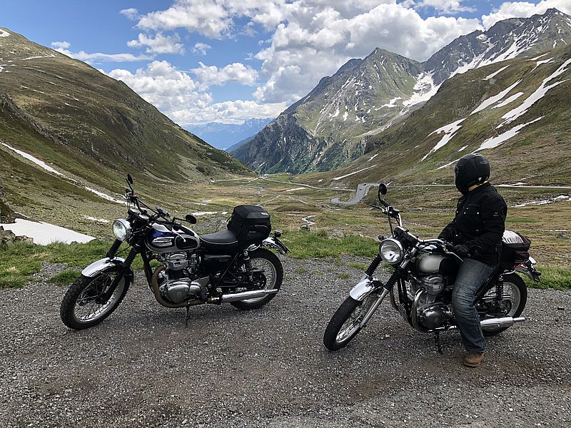 Fehlen tut im Übrigen auch sonst gar nichts im schönen Österreich, denn die Gegend ist perfekt gelegen, um Touren im 5 Länder Eck zu veranstalten, aber auch spannende Aussichtspunkte und Sehenswürdigkeiten mit in die Tour einzuplanen. Carmens und meine erste Tour mit unseren Retro W’s führt uns jedenfalls gleich mal übers Inntal und Pfunds hinein in die Schweiz. Der Flüela- und der Albulapass sind lohnende Ziele und wem die Zeit noch reicht, der nimmt gleich auch noch den Ofen- und Umbrailpass mit. Da wir auf den kleinen Straßen unterwegs sind und uns viel Zeit für Fotos nehmen, fällt der Letztgenannten an diesem Tag für uns aus. Aber das stört uns auch nicht weiters, denn das Wetter ist ein Traum und die Berge haben uns längst in ihren Bann gezogen. Wir überqueren den Flüela rollen durch Davos und nehmen die ersten Kurven der Albula unter die schmalen Reifen der Kawasakis. Weite Blicke wohin das Auge reicht, Wasserfälle und immer wieder das Lichtspiel der Berge führen uns durch die Kehren bis zum Gasthaus Albula-Hospiz in 2315 Metern Höhe. Hier wird uns auch klar, warum recht wenige Deutsche Biker zu sehen sind, denn der Preis ist heiß. 50 Euro eins zu eins von den Schweizer Franken umgerechnet werden wir für zwei Cola einen Cappuccino und 2-mal Pasta los. Doch der Launeverlust währt nur kurz, zu viel liegt vor uns und das nehmen wir an diesem Nachmittag noch mit, bevor wir wieder im Apart Vivaldi landen. Der nächste Tag hält außer Sonne zuerst einmal den Vinschgau für uns parat. Über die Engstelle an der alten Festungsanlage vor Nauders gelangen Carmen und ich zum Reschen und vorbei am berühmten Kirchturm im Wasser. Ein paar Kurven später landen wir dann erneut in der Schweiz, wo uns der etwas grimmig dreinschauende Zöllner doch freundlich durchwinkt. Der Umbrailpass ist unser erstes Ziel heute und dem Spruch folgend ,,Der frühe Vogel fängt den Wurm‘‘ ist dieser Wurm aus mittlerweile bestem Teer fast komplett leer an diesem Morgen. Jan’s Tipp war also goldrichtig. Leider macht uns heute das Wetter etwas zu schaffen, denn während es am Umbrail noch gerade so geht, bleibt bei einsetzendem Regen die berühmte Bratwurst am Stilfser Joch heute aus. Nach den 48 Kehren ist aber auch der Spuk vorbei und in der Ortler-Bar in Schludens lässt es sich vorzüglich speisen. Noch einmal über den Vinschgau nehmen wir bei der Rückfahrt die andere Seeseite des Reschensees und genießen den Blick den die schmale Straße hin und wieder freigibt. Bei Nauders biegen wir dann noch einmal links ab, queren die Norbertshöhe und den Inn am Ende der Martinsbrucker-Bundesstrasse, bevor wir in Viandi den Abzweig nach Samnaun und die dunklen Tunnel wählen. Die Streckenführung ist anspruchsvoll und die unbeleuchteten Tunnel landen zum Chillmodus ein. Samnaun das zollfreie Paradies indes lassen wir aufgrund der späten Uhrzeit links liegen und cruisen zurück nach See. Diesmal allerdings mit dem Abstecher über Tobadill als kleines Schmankerl zum Schluss des Tourtages. Da der Mittwoch aufgrund des Wetters, es regnete nur einmal an diesem Tag, von morgens bis abends, im wahrsten Sinne des Wortes ins Wasser fiel, hatten wir viel Zeit den Donnerstag vorzubereiten. Mit Hilfe von Jan’s Wissen, dem Routenplaner Kurviger.de und dem umfangreichen Kartenmaterial im Haus bauten wir eine Tour, die neben Kurven auch Geschichte und Natur vereinte. Erneut starteten wir früh, stiegen in Fließ in die Kurven ein und besuchten das Naturparkhaus am Kaunergrat. Kaunergrat Wer mehr möchte, sollte auch das Museum in Fließ besuchen, Fließ Museum denn es hat eine Menge an Geschichte zu bieten. Auf dem Kaunergrat nahmen wir indes allen Mut zusammen und gingen auch auf die Aussichtsplattform um freitragend in schwindelnder Höhe den Blick ins Inntal genießen und bildlich festzuhalten zu können. Mit dem anschließenden Naturpark Piller Hochmoor Piller Moor und einem zünftigen Mittagessen auf der voll anfahrbaren Gogles Alm endete der erste Teil des Tages mehr als zufriedenstellend. Über die Höhenstrasse ging die Tour nach dem Mittag an weiter. Mitten hinein ins Kaunertal und auf die Kaunertaler Gletscherstrasse. Diese mit einer Maut belegte Straße, man muß es sagen ist jeden gezahlten Cent wert. Die Natur erschlägt einen förmlich mit ihrer Energie und macht und vor allem auch ihrer Schönheit. Serpentine um Serpentine geht es aufwärts, vorbei an dutzenden Wasserfällen, Steinformationen, Murmeltieren und dem sich immer weiter zurückziehenden Gletscher. Vom dereinst stolzen Eispanzer ist nicht mehr viel zu sehen. Der Rest ist immer noch gewaltig, wird jedoch stetig weniger und das Gesamtbild der Region irgendwann komplett verändern. Umso mehr genießen Carmen und ich den vollkommen ruhigen Moment an der Weissseespitze, bevor die Abfahrt und der Weg zurück in die Pension beginnt. Nach einer weiteren ruhigen und vor allem auch entspannenden Nacht bei Jan und Regina begrüßt uns der Freitagmorgen mit Sonne und einem strahlend blauen Himmel. Erinnerungen werden wach, denn heute geht es zum Abschluss der Reise noch einmal hoch hinaus und ein wenig zurück in die Vergangenheit. Die Silvretta steht auf dem Plan und damit eine der Königinnen der Alpen. Zugleich schwirren uns beim Frühstück aber auch die Gedanken an unsere erste gemeinsame Motorradreise durch den Kopf, die uns im September 2003 schon einmal auf die Bieler Höhe führte. Wir starten die W’s tanken noch einmal voll und beginnen die Fahrt durchs langgezogene Tal hinauf bis zum ersten Abzweig am Kops Stausee. Grüne und saftige Almen begleiten unseren Weg. Wasser sprudelt und fällt aus jeder offenen Ritze im Berg und den Kühen auf den Weiden sieht man ihre Lebensfreude im wahrsten Sinne des Wortes an. Die Motoren verstummen am Talende, Ruhe kehrt erneut ein und der Blick über das Staubecken hinauf in die mächtigen Berge zieht uns in den Bann. Es dauert eine Weile, als uns ein forscher Italiener aus den Gedanken holt