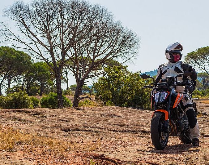 Nach einer Weile auf den engen Landstraßen des Departments Vaucluse schiebt sich gerade jedenfalls langsam der Mount Ventoux oberhalb des TFT-Cockpits ins Zentrum des Blickfeldes und die Vorfreude, auf das was kommt in mir steigt. Beim Blick runter zeigt das Instrument indes auf den ersten Blick schon viele Funktionen, verfügt aber zusätzlich über eine Vielzahl von Einstellmöglichkeiten die wie oben schon beschrieben über die linke Lenkerarmatur abrufbar sind. Ich beschränke mich am Einstieg des Ventoux auf den Switch in den Sportmode und lasse nach einer Gedenksekunde die Pferdchen laufen. Zwei, drei, vier Kurven später sind wir bereits ein Team, was das Beschleunigen und vor allem auch das Einbremsen angeht und es wird klar, warum Fußrastennippel heutzutage total überbewertet werden. So ein Rastengummi ist bei Bedarf viel leichter zu tauschen, warum KTM auf die Rastennippel gleich ganz verzichtet. Die Kleine marschiert mächtig voran, saugt die Kurven auf wie ein Staubsauger, wird aber auf der Bremse genauso vehement von den radial verschraubten Zangen wieder eingefangen. Die Gänge flutschen und bei 9000 Umdrehungen mahnt der Schaltblitz den nächsten reinzudrücken. Untermalt wird das alles durch einen satten Klang aus dem hoch liegenden Edelstahlendtopf.
