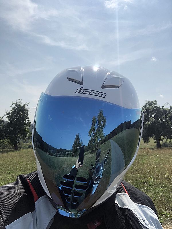 Doch so extravagant wie dieses Visier auch ist, es hat leider auch die eine oder andere Schattenseite. Zum einen ist es noch nicht möglich ein Pinlook zu montieren (das folgt aber mit Beginn der Saison 2019), zum anderen spiegelt es in gewissen Situationen, wie bei solchen Visieren durchaus üblich das Innere des Helmes wider. Dunkle Halstücher sind somit klar von Vorteil. Oder aber man benutzt gleich das helle Visier in Verbindung mit der Sonnenblende.