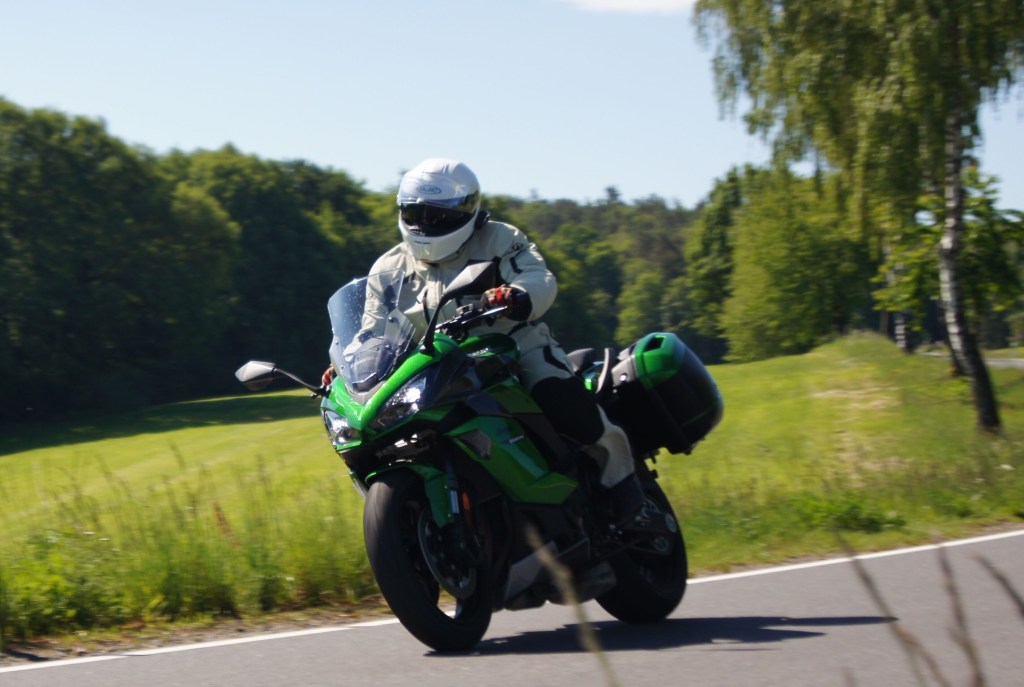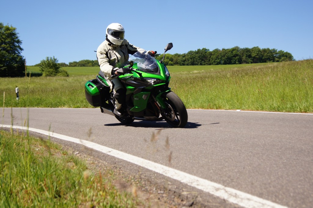 235 Kilo fahrfertig sind für einen ausgewachsenen Sporttourer wirklich nicht zu viel Gewicht. Zudem beträgt der Radstand der kompakt bauenden 1000SX gerade einmal 1440 Millimetern. Damit liegt auch im wahrsten Sinne des Wortes in der Kürze die Würze, ohne dass die Kawasaki dabei in irgendeiner Form nervös oder gar instabil zu werden scheint. Stattdessen lässt sie sich absolut handlich bewegen und bleibt stabil auf der gewählten Kurvenlinie komme was da wolle. Ihr Fahrwerk ist manuell von Hand in Federvorspannung, Zug- und Druckstufe an der Gabel sowie per Handrad in Federvorspannung und Zugstufe am hinteren Federbein einstellbar. Damit lassen sich viele Kompromisse und passende Setups für ein breites Band an Fahrern und Bedingungen finden. Mir persönlich passte die Maschine im Solobetrieb in der Werkseinstellung auf den Straßen des Odenwaldes sehr gut.
