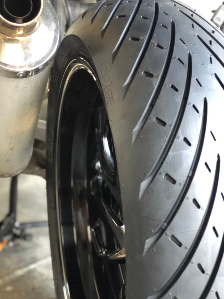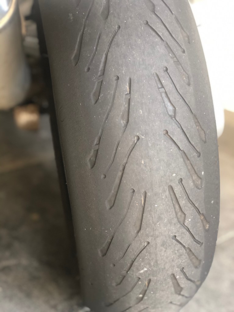 Doch nicht alleine die Form ist wichtig, nein auch auf die Mischung kommt es natürlich an. Besteht der Vorderreifen des 01SE zu 100% aus einer Silica-Mischung, teilt sich der Hinterreifen in mehrere gegliederte Bereiche auf. Die Mitte der Lauffläche (etwa 20%) besteht aus einer Ruß-/Silica Mischung, die für eine gute Stabilität im Hochgeschwindigkeitsbereich sorgt. Weiters verbesserte diese Schicht die Wärmeableitung und sorgt damit für eine längere Haltbarkeit des Reifen. Auf den Außenflächen des Pneu hingegen wird dieselbe Silica Mischung, wie am Vorderrad verwendet, die in Kombination mit den tropfenförmigen Profilrillen für rasches Aufwärmen und optimalen Grip gerade auch bei nassen Gegebenheiten sorgt.