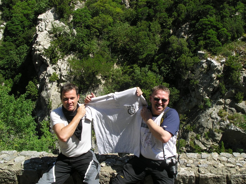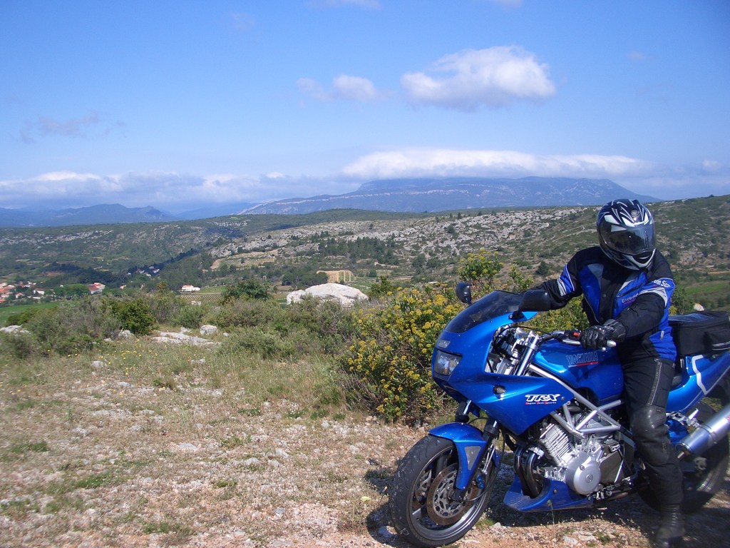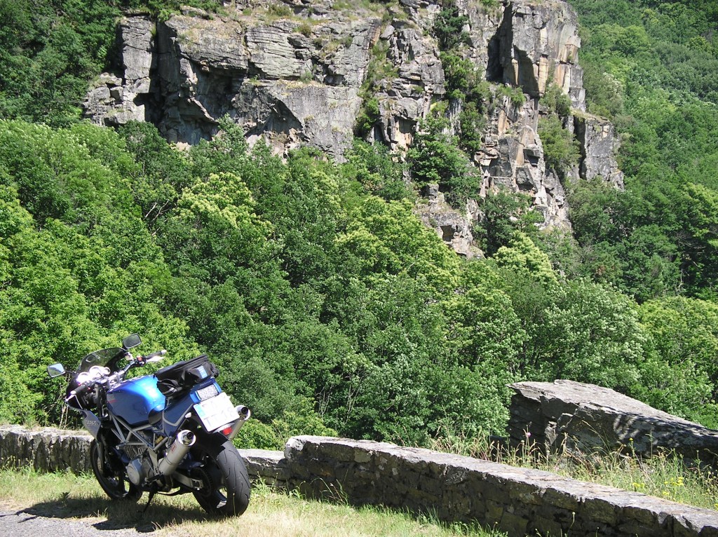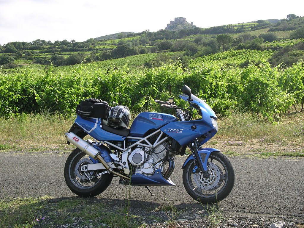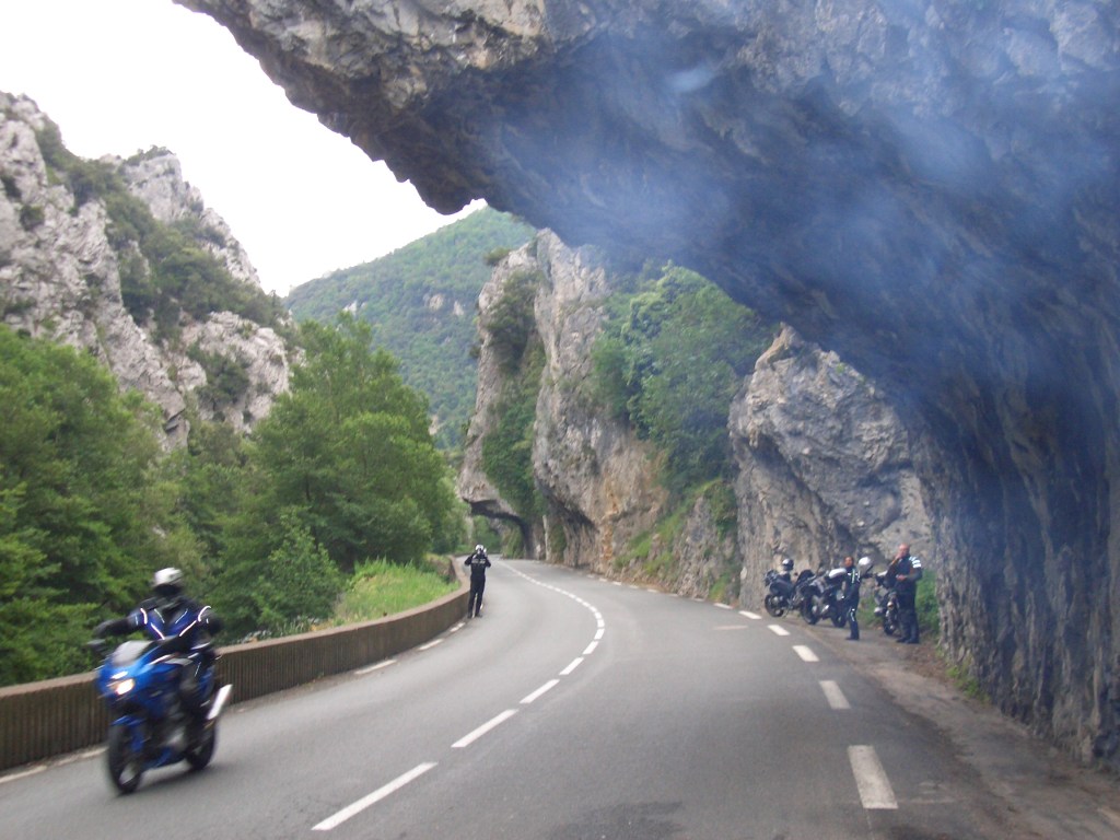 Rauschendes Wasser für den einen hat es eher eine treibende Wirkung, andere Menschen fühlen sich beim Anblick eines Wasserfalles zutiefst glückselig. Klaus ist einer dieser Menschen und so lag es nahe ihm natürlich eine Freude zu machen und die Fontaine de Fontestorbes in Belesta zu besuchen. Der Weg dorthin ließ uns aber vorerst einmal in die andere Richtung und über den Col de la Garouillière, den Col de l’Homme Mort und weiter im Süden über den Col du Linas rollen. Allesamt keine echt hohen Berge, sondern eher Mittelgebirge aber ummalt von Bergen, Bäumen, Plateaus, hin und wieder einer wachsamen Burg und zudem durchzogen von eben den kleinen Straßen, die sich wie Adern im Körper durch diese Landschaften hindurch ziehen. Ja es machte enorm viel Spaß so zu touren und all das erleben zu können. Klanglich wurde die Szenerie zumindest bei mir immer wieder vom dumpfen Klang der TRX und dem Zwitschern ihrer montierten Flachschiebervergaser untermalt, wenn es an einer der vielen steilen Steinwänden vorbei ging.
