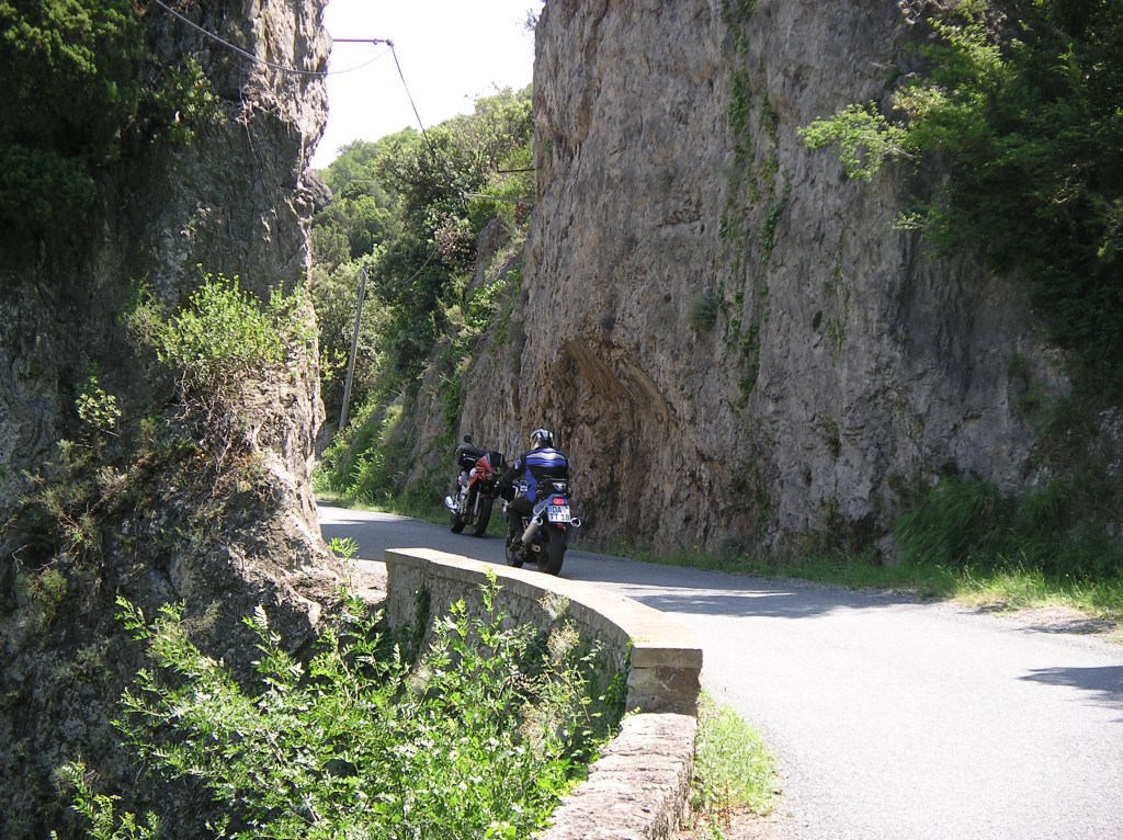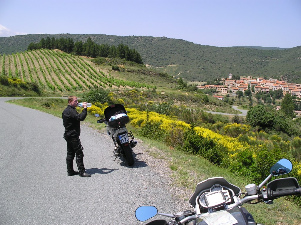 Nicht Fisch und auch nicht Fleisch so könnte man es auch beschreiben, aber tatsächlich lief uns am dritten Tag die Zeit davon. Für Andorra, was wir gerne gesehen hätten, waren wir zu weit nördlich, für die spanische Grenze reichte es auch nicht ganz, aber was wir erlebten war ein Tourtag mit weiten Blicken und bei der Ankunft in der Unterkunft am Abend eine spürbare Faszination in uns. Vorab und ohne angeben zu wollen, wir machten aus 200km an diesem Tag 400km und die gingen zunächst von Moux über den Col de la Garouillière nach Süden. Weiter am Col du Garavel vorbei nach Planes und zum Viadukt am Pont de Cassagne, wo wir nach einer längeren Pause der N116 bis hoch bis nach Prades folgten. Die Sonne brannte an diesem Tour Nachmittag so richtig heftig am Himmel und eins ums andere Mal hielten wir an einem schattigen Platz, um den Wasserhaushalt in uns aufzufüllen und eine Pause zu machen. Beinahe jedes Mal klickten dabei die Handys und Kameras, wenn die Blick über die freien Flächen der Hochebenen, über die wir fuhren, schweiften oder hinab in die Schluchten fielen, die wir an diesem Tag passierten. Kurz gesagt wir hatten alles was ein Motorradtourerherz erleben möchte und für uns noch ein wenig mehr. Und genau so endete er auch dieser besondere Tag, nach tatsächlichen 400km auf der Uhr mit der untergehenden Sonne hinterm Weinberg von Laz-Clauzes. Holger selbst konnte es an diesem Abend nicht glauben was wir da getrieben hatten, aber er lächelte und insgeheim glaube ich dachte er nur was für verrückte Typen. 😊