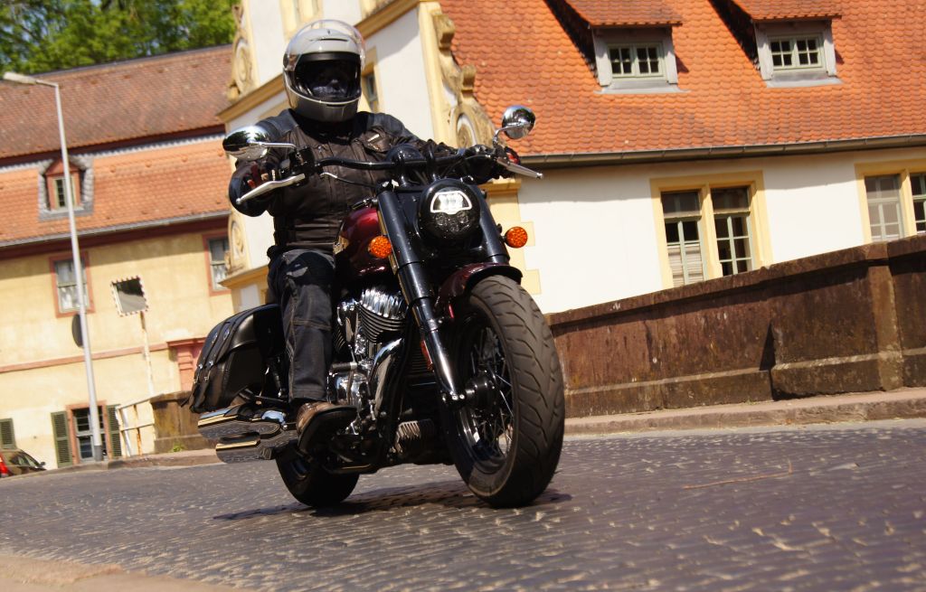 Of course, the real feeling for the Chief doesn’t come in stop-and-go traffic in the city, nor does it come at full throttle on the motorway. No, it shows its strengths in cruising mode on country roads. Here, it shows that it is possible to ride sporty curve radii even with running boards, without immediately causing metal abrasion. It pulls straight through the bends and, thanks to its tightly tuned chassis, also precisely on the intended line. With so much verve, an unbelievable smile shoots under your helmet as a rider, because the Indian Twin underlines the acceleration out of the bend with its Euro5-compliant V2 sound. The engine, along with the excellent frame and chassis construction, is the heart of this machine, and one that definitely raises the heart rate. It is precisely with this pulsating feeling underneath me that I first let the next bends and kilometres go on and enjoy the relaxed ride in the Chief’s saddle.