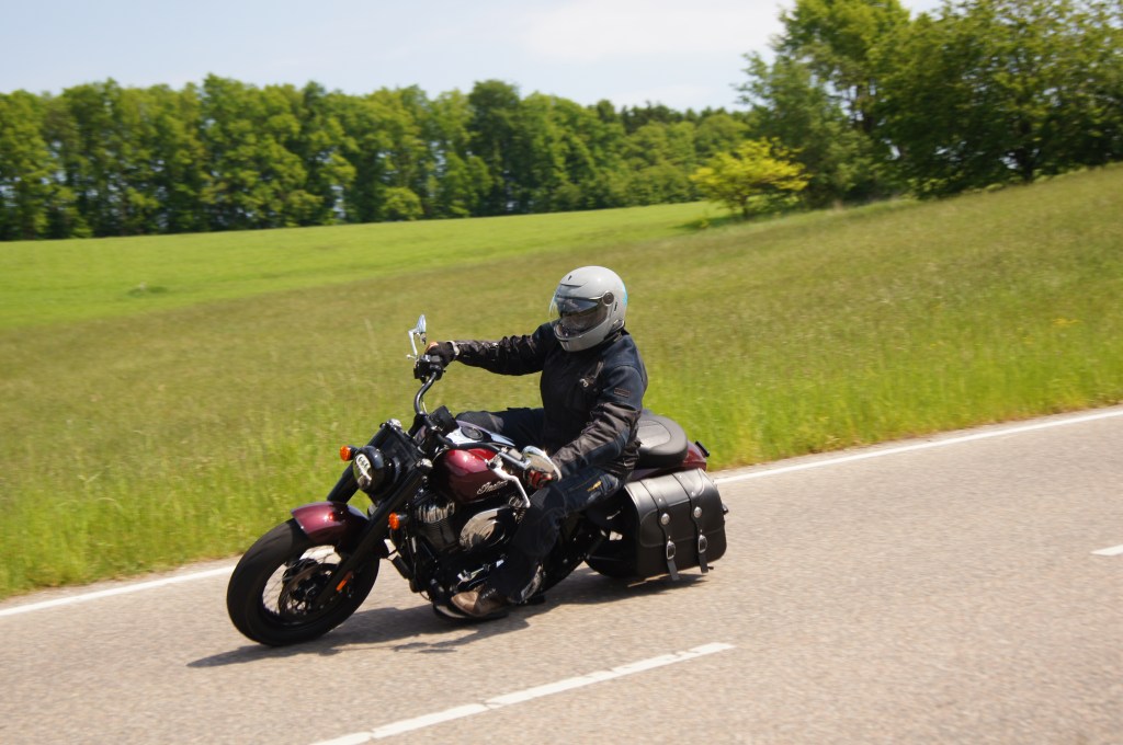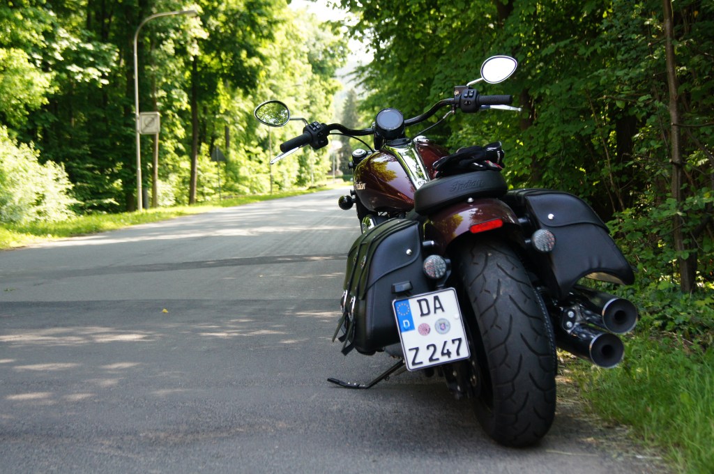 Das wahre Gefühl für die Chief kommt aber natürlich nicht im Stopp and Go Verkehr in der Stadt und auch nicht beim Dauergas auf der Schnellstraße. Nein ihre Stärken spielt sie im Cruising Mode auf den Landstraßen aus. Dabei zeigt sie, dass man auch mit Trittbrettern durchaus sportliche Kurvenradien fahren kann, ohne dass es sofort zum Metallabrieb kommt. Schnurgerade zieht sie durch die Kurven und dank ihres straff abgestimmten Fahrwerkes auch zielgenau auf der erdachten Linie. Bei so viel Elan schießt dir als Fahrer ein unglaubliches Lächeln unter den Helm, denn der Indian Twin untermalt das Herausbeschleunigen aus der Kurve mit seinem Euro5 konformen V2 Sound. Überhaupt ist der Motor neben dem ausgezeichneten Rahmen /Fahrwerk Konstrukt das Herzstück dieser Maschine, und zwar eines welches die Herzfrequenz definitiv ansteigen lässt. Genau mit diesem pulsierenden Gefühl unter mir lasse ich erst einmal die nächsten Kurven und Kilometer weiter laufen und genieße das entspannte Fahren im Sattel des Chiefs.