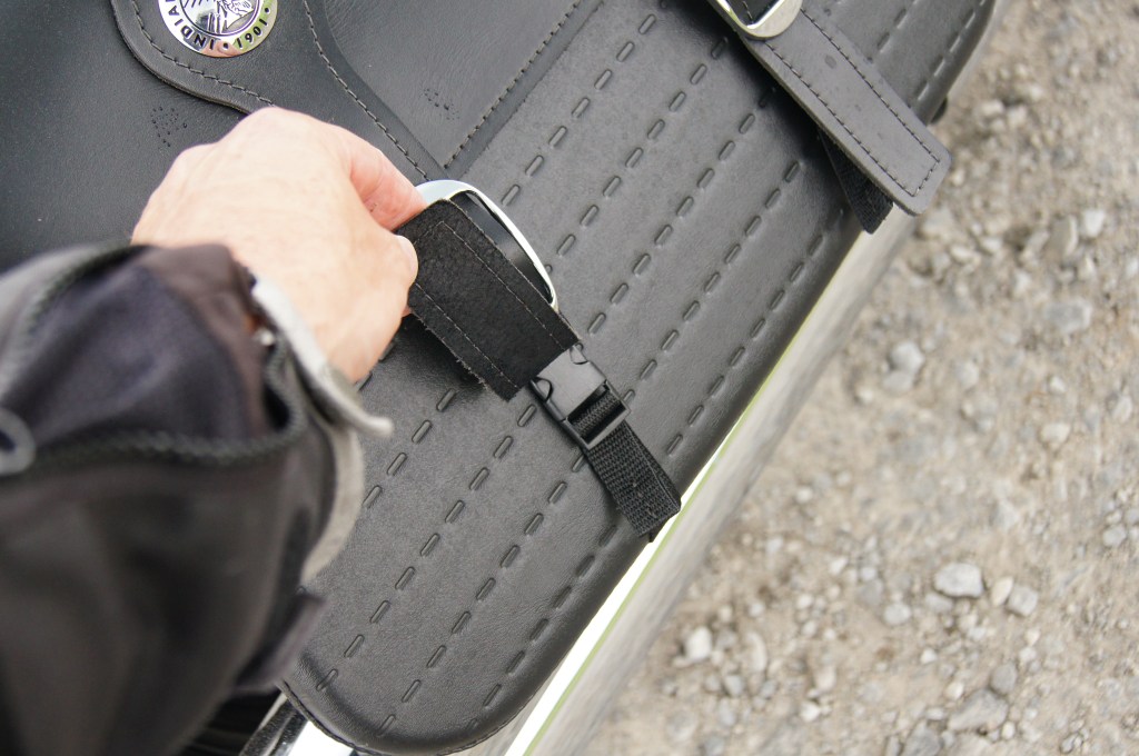 Weiters verläuft die Stahlflexbremsleitung der vorderen Bremse leider ungünstig über das seitlich angebrachte Lenkradschloss, was das Abschließen der Maschine fummelig gestaltet. Teile der Elektronik liegen mehr oder minder ungeschützt im Schlagbereich hinterm Vorderrad. Ja und wer bei den wertigen anmutenden Ledertaschen auf ebenso wertige Verschlüsse hofft, der wird leider durch Plastikklicks alla Scout Ranzen etwas enttäuscht. Das ist Fertigungstechnisch heute nicht mehr unüblich. Es passt aber so gar nicht zum sonst wertigen Auftritt der Maschine mit ihren Metalldeckeln, metallenen Fendern und diesem wunderschön gemachten Motor.