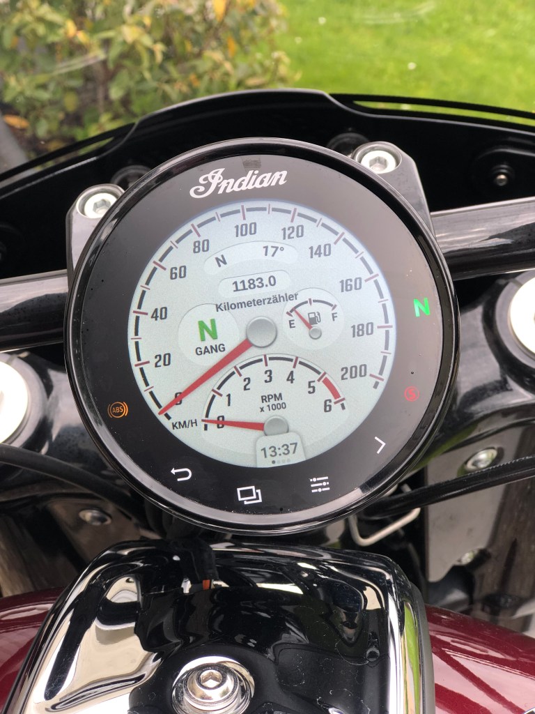 Nach gut und gerne 250 Testkilometern haben der Häuptling und ich dann aber erst einmal genug Strecke hinter uns gebracht und ich halte für eine kleine Pause an. Der Tag ist noch jung und so ist genügend Zeit, um die Maschine noch einmal eingehender unter die Lupe zu nehmen. Hierbei fällt einer der ersten Blicke neben dem chromstrotzenden Motor automatisch auf das digitale Rundinstrument. Dieses 101 mm große, Ride Command-System genannte Farb-TFT hat vielfältige Funktionen und zudem eine integrierte Turn-by-Turn-Navigation. Smartphones werden bei Bedarf einfach per Bluetooth eingebunden. Man zeigt damit ganz klar, dass sich TFT und Emotion mit ein bisschen Aufwand durchaus vereinen lässt. Denn auf dem Display drehen sich, wenn auch digital wahrhaftige Zeiger vorm Auge des Fahrers. Allerdings würde es hier den Rahmen sprengen alle Funktionen aufzählen. Daher ist mein Tipp, probiert doch einfach eine der Chiefs in einer Testfahrt einfach mal selbst aus. Glaubt mir es ist alles da ist was man braucht und noch Vieles mehr. Das Cockpit lässt sich dabei intuitiv, wechselseitig über drei Taster an der linken und rechten Schalteramatur der Maschine bedienen, oder auch leider etwas fummelig mit Handschuhen direkt am Instrument.