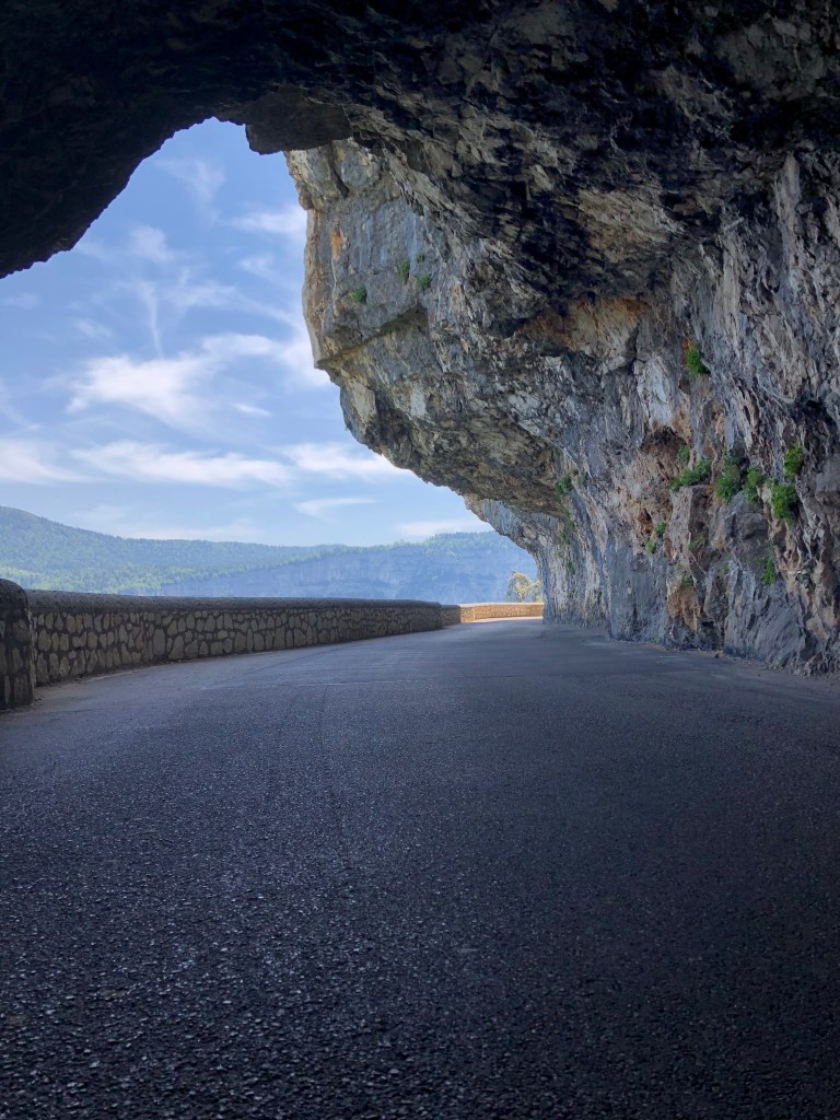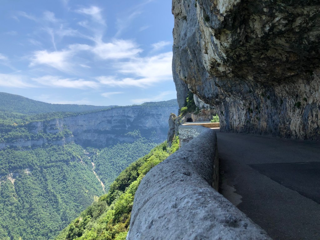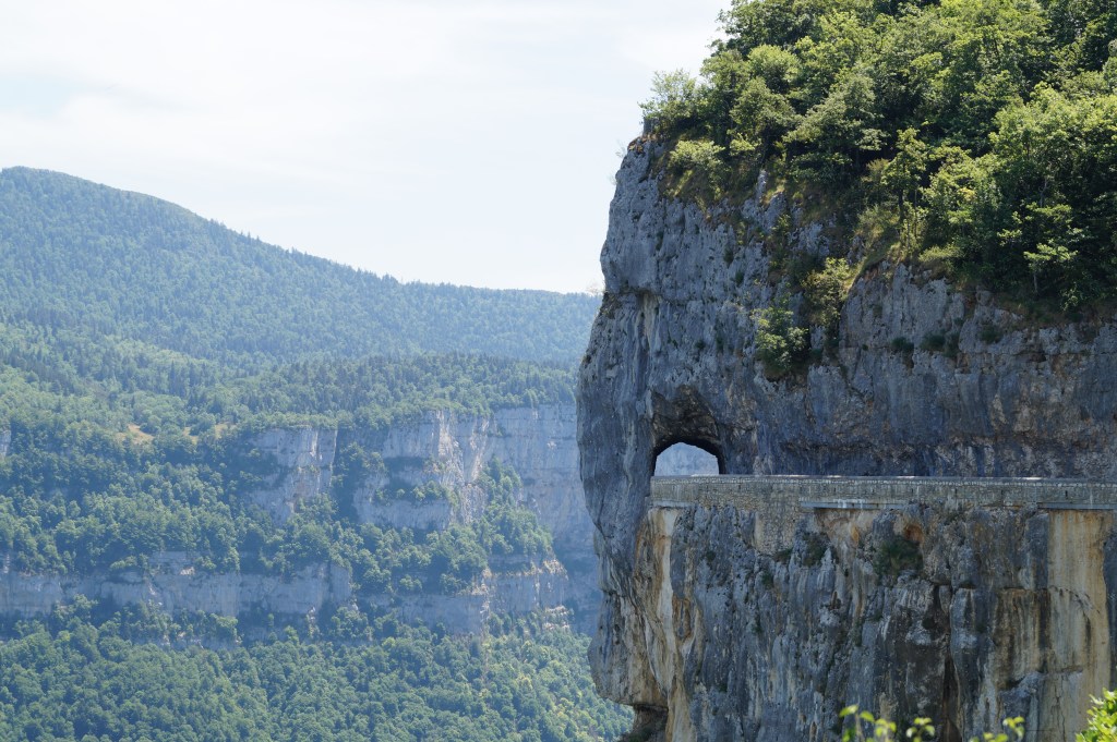 From Valreas you can cover the 130 kilometres to Come Laval via the Drome valley and the Col du Rousset. If you keep in mind the curves of the Col du Rousset, which we drove to get there, the Col De La Machine is basically a rather unspectacular pass at an altitude of 1100 metres. At the same time, however, this is also one of the central traffic junctions of the Vercors, which distributes the traffic over various passes and routes. And then there is the real highlight of this road called D76, the Cirque de Combe Laval. A monument of road construction carved in stone with small boundary walls facing the abyss, it was built between 1893 and 1896. The views (you should have little or no fear of heights) into the Laval valley, which is up to 600 metres deep, are almost phenomenal, as is the adventurous routing of the road in this section. Tight bends are followed by tunnels and tight bends again, and at every corner you want to stop and take another photo. If you are lucky, as we were this time, you are almost alone up there and can literally hear the silence of the pass. After about 3.5 kilometres, however, the whole spectacle is over again and you enter more relaxed territory in both directions of the road. But there is also a lot to see and experience afterwards, because the Vercors is diverse in every direction.