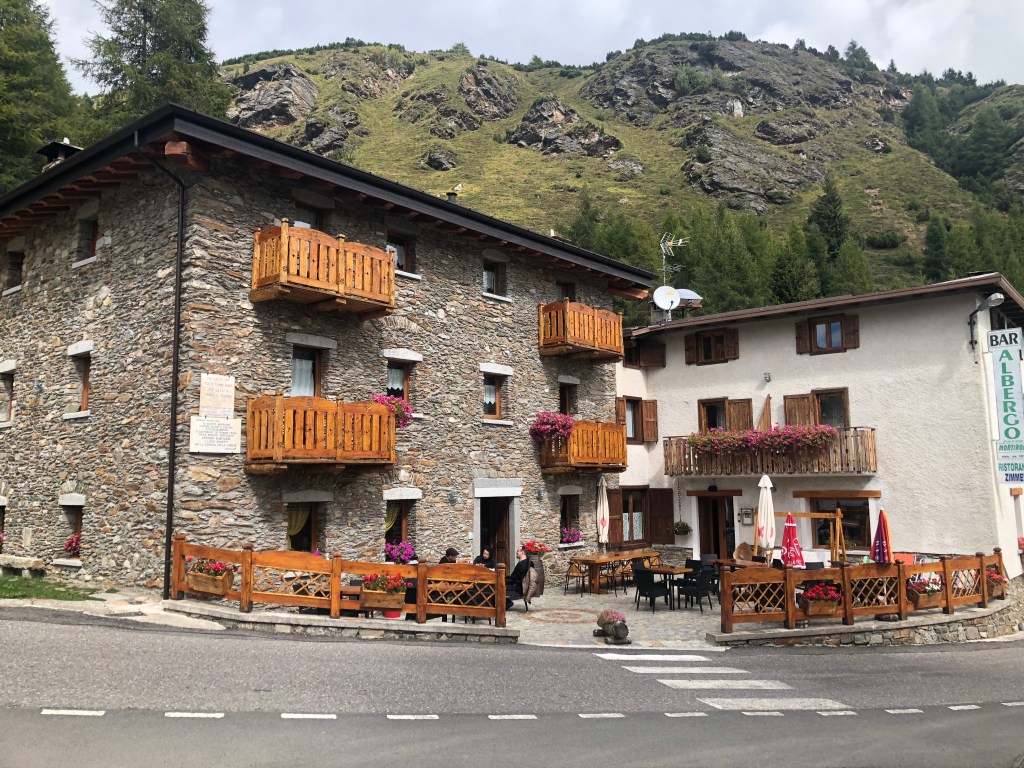 The Foppa Pass, Ital. Passo della Foppa, today better known as Passo del Mortirolo, crosses the mountains a little further south and is already waiting for us. Well, he doesn’t know it yet, but it is our chosen route to the lake and, unbeknownst to us, we are very curious to see what this route has to offer. It connects the towns of Mazzo di Valtellina in the west, from where we ride it, with Monno in the southeast. We already turn into the pass road before Mazzo di Valtellina. A little further south in the village, there is another entrance up the mountain, as we learn later when researching this text. The single-lane road winds its way up the mountain at a sporty 10 % to the crest at 1852 m. The scenery there is enchanting and the road is very steep. The landscape up there is enchanting, and again and again our eyes wander to the right and left to the aforementioned restaurant at the beginning of the text. Its name, by the way, is Bar, Albergo, Passo Mortirolo and you can eat well there, as well as sleep. From here we go down the mountain to Monno, which we reach after our break, a total of about 30 tornati and the approximately 28 kilometres of the route. Yet this choice of route was worth every single kilometre. Because there is rarely much traffic here, nature predominates, making the Mortirolo a real alternative to the northbound Gavia Pass for us ever since.