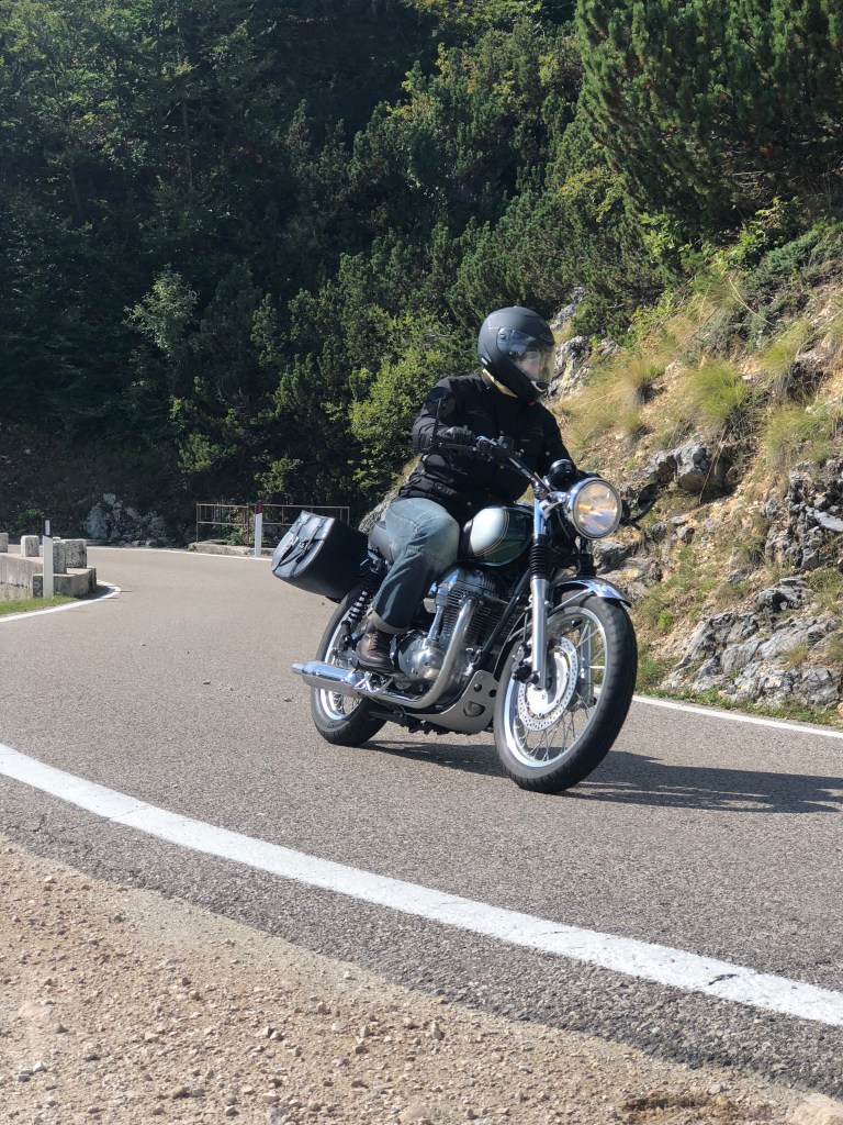 … it is sometimes time to get up, because next to the feathered fowl the sun is already winking through the slits in the curtain. Carmen and I are already on holiday in Laas for a few days and apart from the sights in Merano and the surroundings of Vinschgau, we would also like to enjoy Lake Garda a little. This is agreed with our hotel owner and so the convertible and trailer are left in the backyard and we set off south with our W’s. No, as is so often the case, we don’t drive over the lake. No, not as so often over the famous Joch! This time we head towards the sun over the Umbrail Pass. The traffic in the often overcrowded Vinschgau Valley actually makes us grin under our helmets today, as we make good time. Before reaching the Münstairtal, however, it becomes noticeably quieter and the first curves of the Umbrail follow in a leisurely flow. This pass, which is now paved throughout, is always a sensational experience. Despite this, it still retains much of its original character and the traffic is kept to a minimum. At the top, we take a few pictures of the scenery before starting the descent over the backside of the Stilfser Joch. We pass through Bormio easily today, but choose a different route than usual over the Gavia Pass.