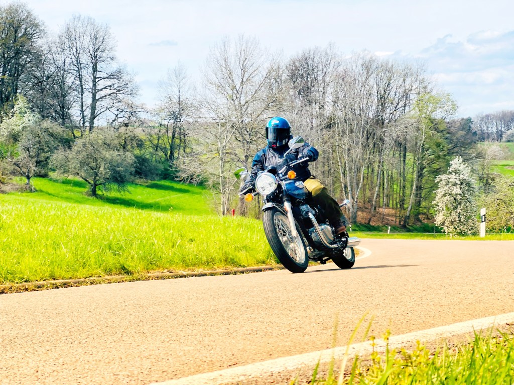 So we definitely glide smoothly through the curves, like the gears through the gearbox. There are still 5, but here, too, the model has grown compared to previous vintages. Speaking of growing, pride of ownership grows in the sun at the Marbach reservoir at the latest, because although the new one no longer has a kick starter, there is still the royal shaft on the right side of the engine and a whole lot of shimmering chrome. In general, the 225 kg machine still has a lot of metal to offer, where other well-known manufacturers resort to cheap plastic. That’s striking, and talking about petrol is always a nice way to pass the time between the tour sections. It’s also great to mention that the engine has 773 cm³, A2 produces a friendly 48 hp and a respectable 64 Nm of torque at 4800 revs. Only the colour makes the corners of your mouth curl down a little. Yes, there is actually only one colour combination for the 2023 model year and that is Metallic Slate Blue / Metallic Diablo Black. It sounds silly, but that’s the way it is, and positively speaking, you can’t go wrong with it.