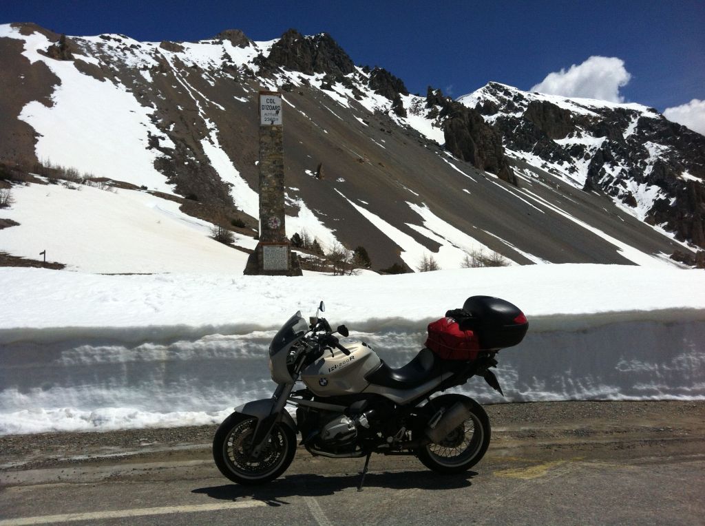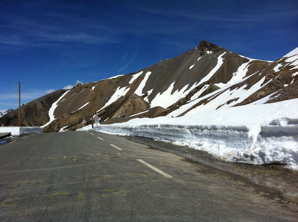 Die Jungs und ich sind derweil im Flow und steigen durch die felsige Landschaft immer höher hinauf bis zur Passhöhe. Zehn Serpentinen sind es bis dorthin, die an diesem Fahrtag ähnlich wie beim Cayolle und Vars zuvor etwas mehr Zeit in Anspruch nehmen, als man gemeinhin erwarten würde. Die Sonne scheint, der Himmel ist strahlen blau und in Verbindung mit den Schneewällen rechts und links neben der Straße entsteht eine ganz besondere Atmosphäre und natürlich die passenden Bilder dazu. Die Passmarke finden wir an diesem Tag übrigens noch halb eingeschneit vor.