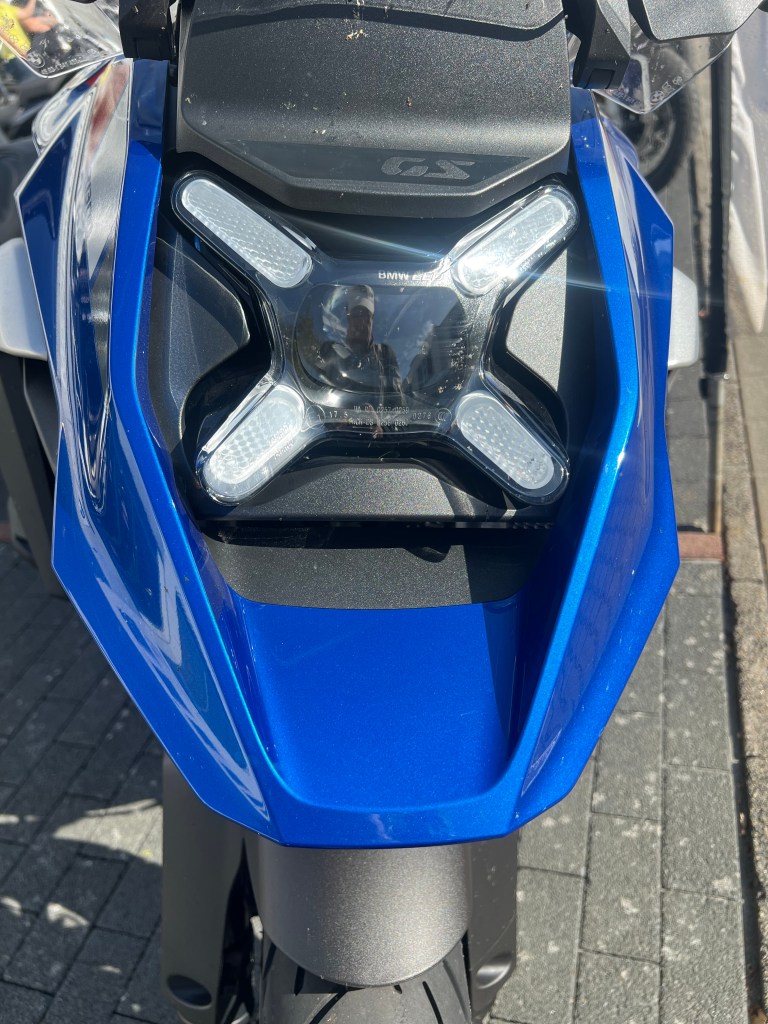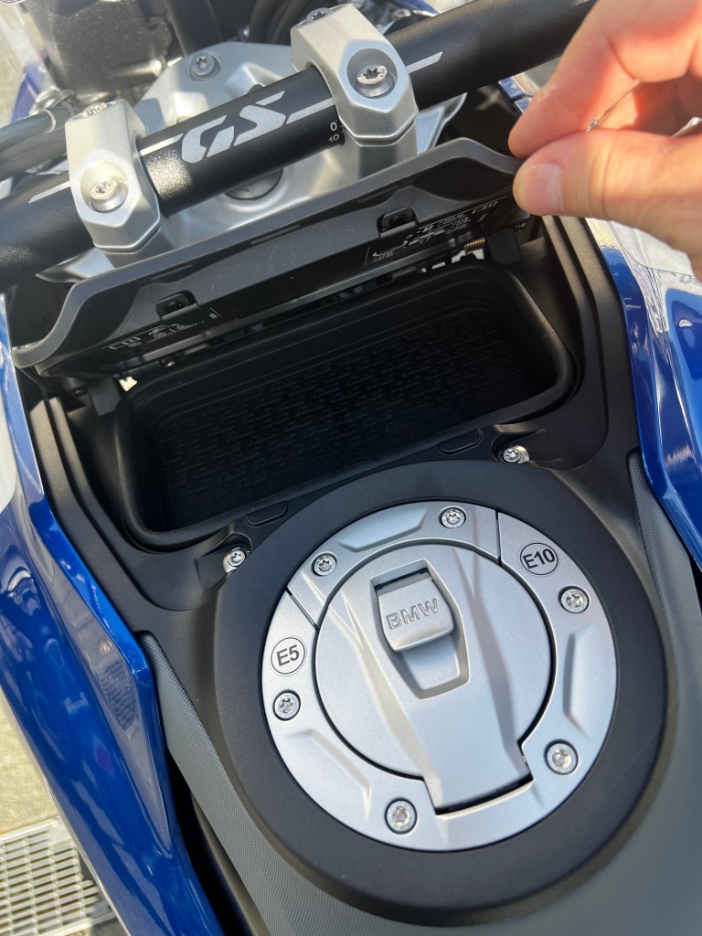 Über Geschmack lässt sich bekanntlich nicht streiten, oder doch? Nennen wir die Abkehr vom klassischen Frontgesicht, mit Karl Dall Blickt, hin zur neuen Lichteinheit einfach mal eine provokant, polarisierende Veränderung. Eine die gefällt, oder eben halt nicht gefällt. Auf jeden Fall entsteht in Verbindung mit dem steileren Schnabel und dem elektrisch höhenverstellbaren Windschild eine weniger zerstückelte Frontpartie, die zugleich seitlich betrachtet harmonischer in die Tank- Sitzbanklinie übergeht. Designtechnisch praktisch gelöst ist dabei der Übergang von der Sitzbank in den Tank. Man spart sich mit dem fortführenden Sitzbankbezug auf Dauer den Tankpad. Wie lange dieser Kustlederbezug dort hält wird die Zukunft zeigen. Das nicht abschließbare Ablagefach vor dem Tankdeckel ist praktisch und nimmt unter anderem den Schlüssel, die Sonnenbrille oder andere Utensilien auf. An der Frontpartie wandern die Blinker von der althergebrachten Position in die Handprotektoren. Wie das im Gelände und bei einem Sturz dann ausgeht wird BMW sicherlich ausgiebig getestet haben, denn in den Foren ist es schon jetzt ein heiß diskutiertes Thema, ähnlich wie der neue Scheinwerfer. Aber keine Angst alternativ kann man die Blinker auch an der alt angestammten Position bekommen.