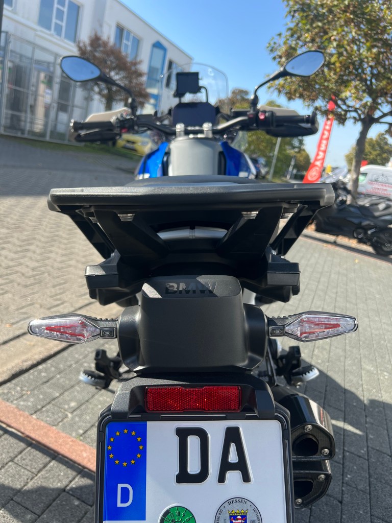 There’s no accounting for taste, is there? Let’s just call the departure from the classic front face with a Karl Dall look to the new light unit a provocative, polarising change. One that pleases, or doesn’t please. In any case, in combination with the steeper beak and the electrically height-adjustable windshield, the result is a less fragmented front end that, when viewed from the side, blends more harmoniously with the tank-seat line. The transition from the seat to the tank is a practical design solution. The continuing seat cover saves the tank pad in the long run. Only time will tell how long this leather cover will last. The non-lockable storage compartment in front of the fuel filler cap is practical and can hold keys, sunglasses or other utensils. At the front, the indicators have been moved from their traditional position to the hand protectors. BMW will certainly have tested this extensively off-road and in the event of a crash, as it is already a hotly debated topic in the forums, similar to the new headlight. As with the front, the rear section has also been given a helping hand and is dominated by black plastic in addition to the colour-coordinated die-cast aluminium frame already mentioned. The tail light and indicators form a unit on the number plate bracket, with a thick plastic block between them. This will probably make it difficult to make any major changes to the rear of the GS. Because it looks like it belongs to the Riding Assistant with Active Cruise Control (ACC), the Front Collision Warning (FCW) and the Lane Change Warning (SWW) system which, according to BMW, should ensure even safer and more comfortable motorcycling. Considering that 2/3 of the bikes are ridden in full pannier mode anyway, this is probably not so noticeable in the end.