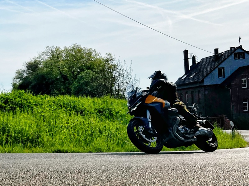 Zwei Abbiegungen geht die Tour raus aus dem Ort und auf der Landstraße kommt die Stelvio erst richtig in Fahrt. Leider ist die von mir gefahrene Maschine nicht mit dem aufpreispflichtigen bidirektionalen Quickshifter für runde 200 Euro ausgestattet. Aber auch konventionell flutschen die Gänge ungemein flink durch das Sechsganggetriebe und lassen bei 6500 Umdrehungen das maximale Drehmoment von 105 Nm auf das Hinterrad los. Die Maximalleistung von 115 PS kommt etwas später, nämlich bei 8500 Umdrehungen zum Tragen. Natürlich, und wie sollte es bei Guzzi auch anders sein, überträgt der Motor seine Kraft über einen stabilen Kardanantrieb auf das Hinterrad. Gegen groben Unfug und zu viel Drehmoment schützt eine mehrstufige Traktionskontrolle. Sie arbeitet ähnlich wie das Kurven-ABS und das PFF Rider Assistance System versteckt im Hintergrund.