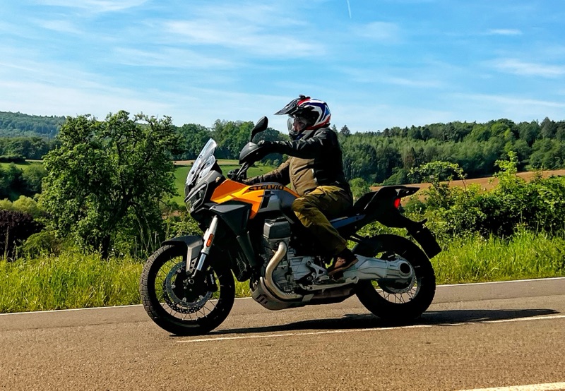 One press of the start button and the mighty V-two comes to life. And it does so with a vehemence and a sound that at first you can hardly believe that the machine has Euro 5 approval. At the same time, the engine also awakens the Moto Guzzi spirit that so many loyal followers and fans of the brand have learnt to appreciate and love over generations. Yes, the Stelvio is alive and kicking, and that’s how it should be, dear readers. The smooth and hydraulically operated clutch lever is easy to reach, ‚clonk‘ the first gear is in the still cold transmission and the journey begins. Until it reaches operating temperature, the 1042 cc engine shows its character a little more clearly, after which both the gear changes and the engine running become smoother, but please friends, you never forget what you’re riding and where it comes from, and that’s great.