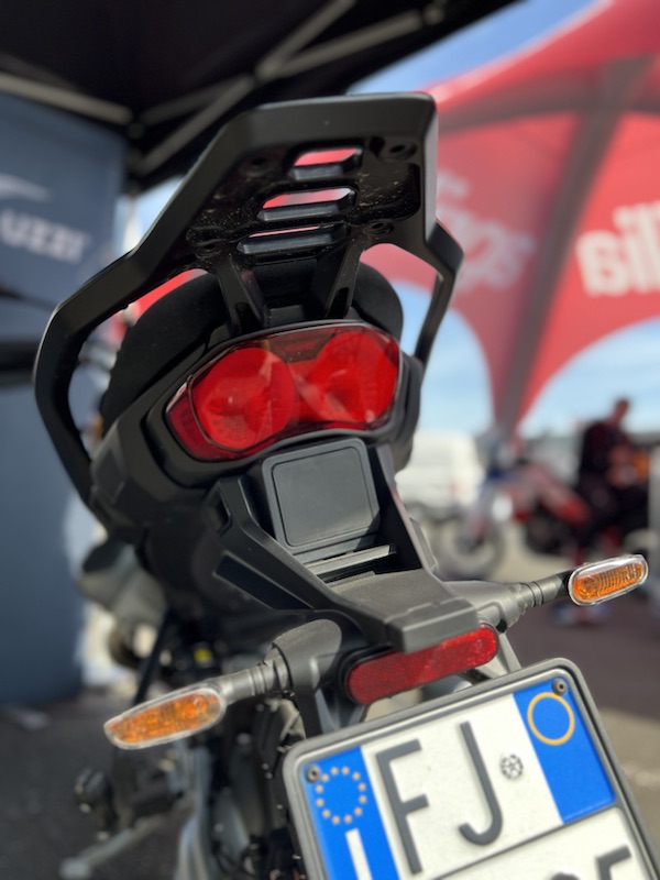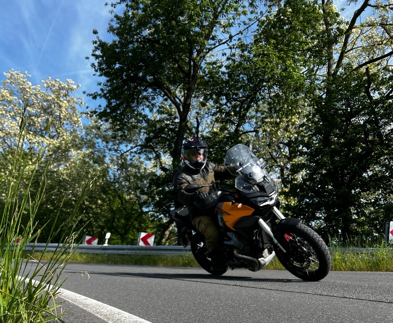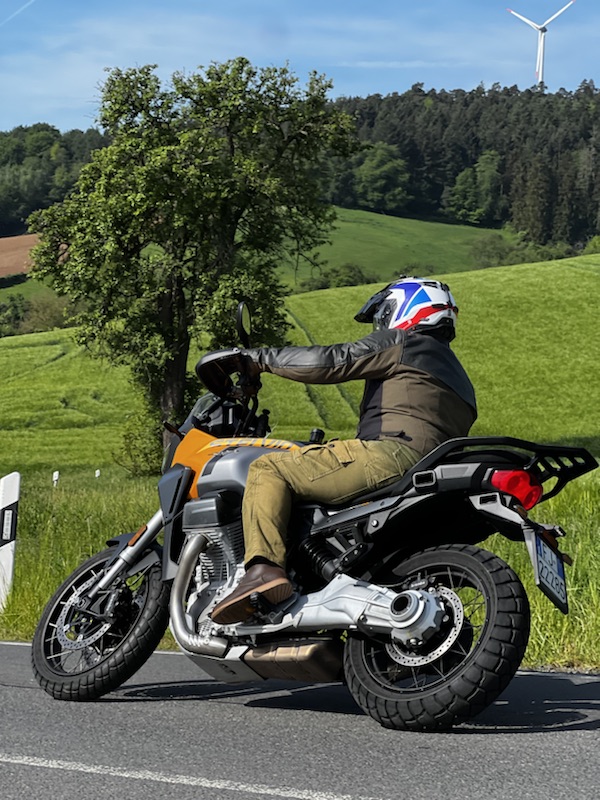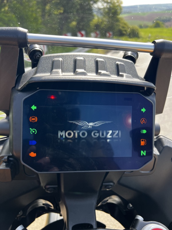 The tour takes two turns out of town and the Stelvio really gets going on the country road. Unfortunately, the machine I drove is not equipped with the bidirectional quickshifter, which costs around 200 euros. But even conventionally, the gears slip through the six-speed gearbox extremely quickly and release the maximum torque of 105 Nm to the rear wheel at 6500 rpm. The maximum output of 115 hp comes into play a little later, at 8500 rpm. Of course, and how could it be otherwise with Guzzi, the engine transmits its power to the rear wheel via a stable cardan drive. A multi-stage traction control system protects against rough mischief and too much torque. It works in a similar way to the cornering ABS and the PFF Rider Assistance System hidden in the background. Behind PFF is the Piaggio parent company’s 4D radar system with (FCW) front radar, which also acts on the integrated cruise control system (FCC) and regulates the speed of the machine in relation to the vehicle in front by actively intervening in the engine brake. Blind Spot Assist (BLIS) and the rear radar (LCA) round off the safety system and warn the driver of hazards as required via signal LEDs in the mirrors and a red triangle in the fully digital TFT colour display. This in turn leaves nothing to be desired in terms of display, as do the five available driving modes, which can be conveniently set using a button on the right-hand end of the handlebars. The clearest difference between the modes can be felt in Rain Mode, as this is where the reduced throttle response is most noticeable. Off-Road Mode deactivates the rear ABS for off-road riding and automatically sets the traction control to level 1, although this can also be switched off completely at the touch of a button. All other modes live up to their designations Sport, Road and Tour very well and can be customised individually on the tour according to preference and taste.