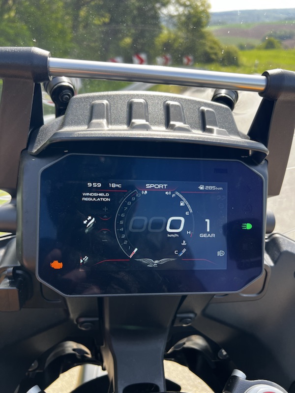 When it comes to customisation, the Stelvio also scores highly in terms of seating comfort. In addition to the standard seat height, there are both higher and lower bench seats with and without seat heating (2 cm each). At a height of 170 cm, the low bench seat probably suits me a little better than the standard bench seat that I rode in the test. The knee angle at the standard height is relaxed, which promotes relaxed gliding along the narrow lanes. But of course the Stelvio can also really fire if you let it. The short exhaust stub on the right sings its cheerful song out into the countryside and clearly says here I come. Yes, in addition to the awakening springtime nature, confidence in the qualities of the Guzzi increases with every bend. The wide handlebar, which is mounted a little too far forwards, is not really a brake on fun, but in my case with short arms it would simply be more comfortable turned a little further back. All switches and buttons are easy to reach and you can feel their pressure points, which is a particular advantage when wearing thicker gloves. Only the indicator switch is mounted a little far towards the rider, so you have to demonstrate a little more dexterity with short fingers. Speaking of switches, here we come to what is now a real rarity in the touring enduro class. The built-in electrically infinitely adjustable windscreen can be operated via the switch cross on the left handlebar end. During testing, it didn’t fit me quite so well in the lower position, but it worked perfectly at the top. In the end, it has something to do with body size, personal preference and the helmet, but I think everyone will find their own setting.