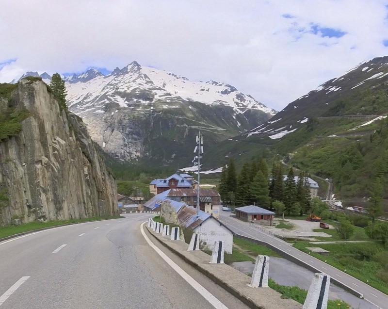 Once again, the sun rises over the mountains and the Rhone glacier. Its bright red rays shine through the windows of the Hotel Belvedere, where we enjoyed our glacier ice cocktails the night before. Goldfinger and the Bond men have long since left the pass and gone about their business. But the sun’s rays show us another way, the way to the other side of the mountain, to the Grimsel Pass.