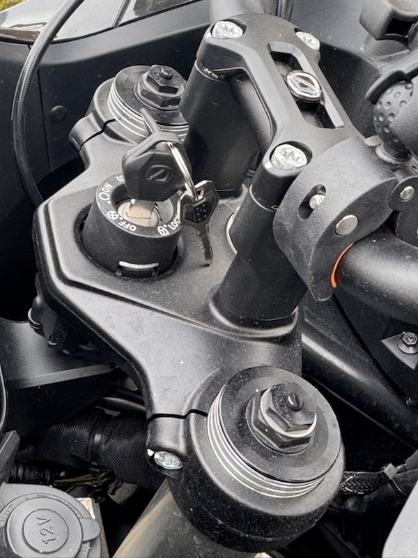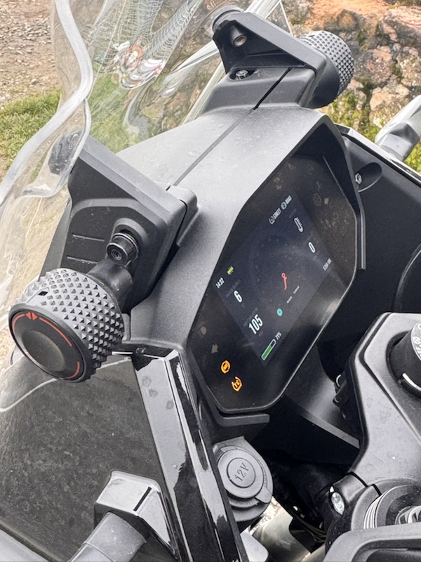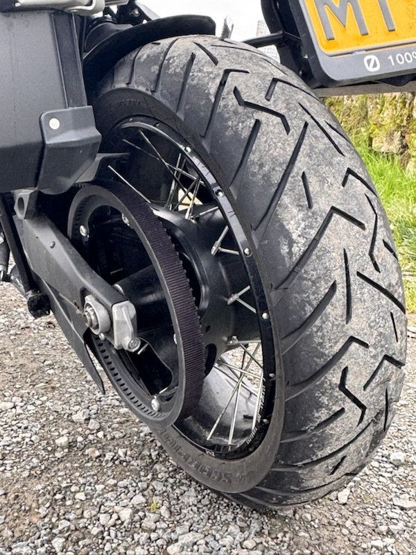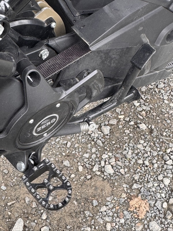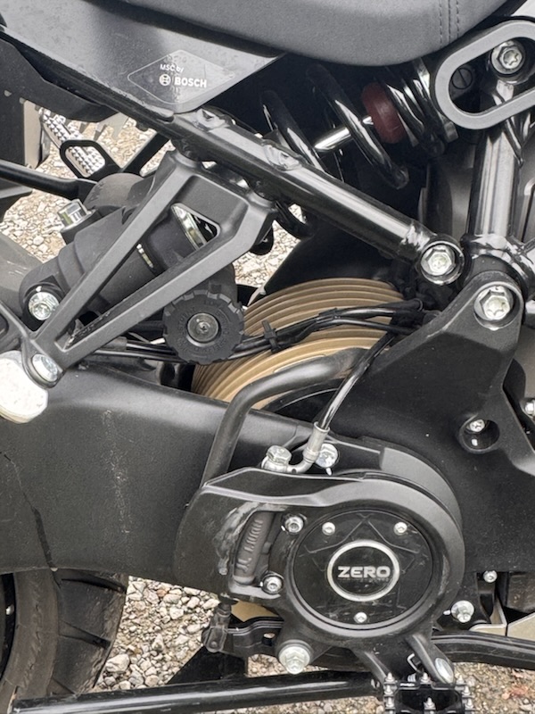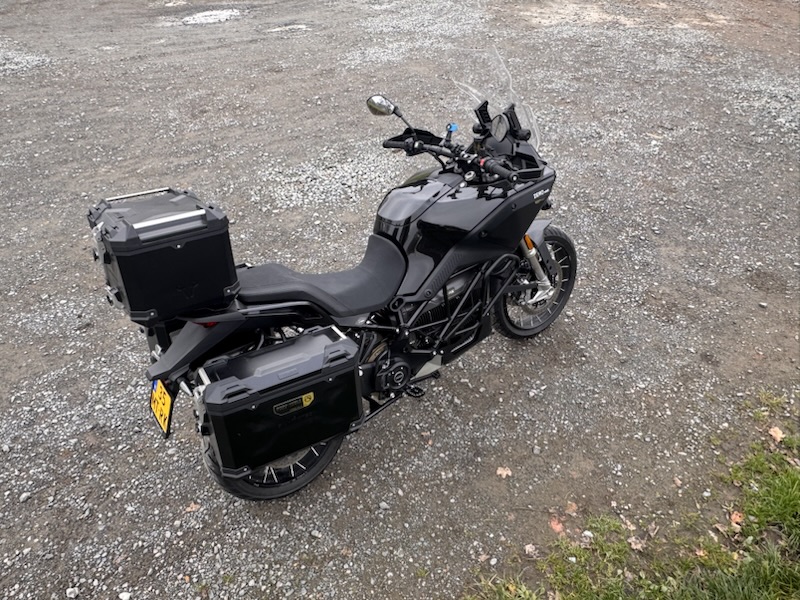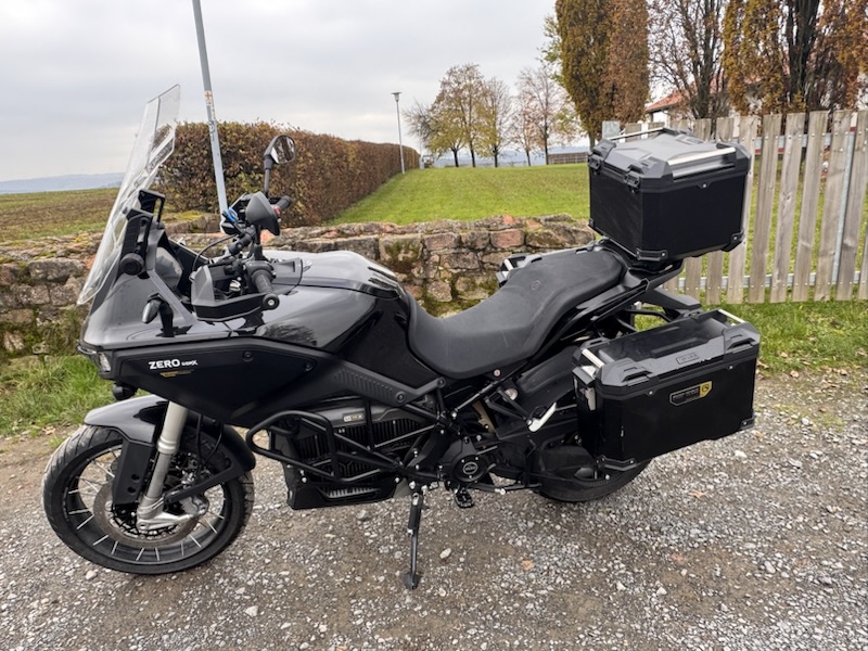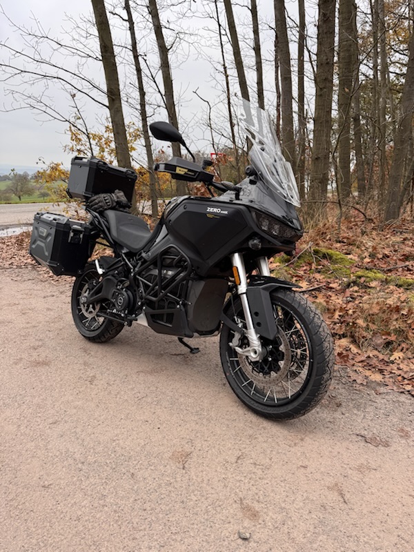 Doch weiter mit der Zero, die den Fahrer/Fahrerin in einer Sitzhöhe von 805 mm bis 865 mm sehr bequem im Sattel aufnimmt. Dabei liegen die übersichtlichen Bedienelemente sehr gut vor einem. Diese lassen sich nach einer kurzen Eingewöhnungsphase intuitiv bedienen und das Ergebnis ist auf dem 127mm breiten TFT-Farbdisplay zu sehen und beim Wechsel der Fahrmodi im Antriebsstrang zu spüren. Für 26.500 Euro bekommt man bei der Black Forest neben den verschiedenen Fahrmodi auch eine mehrstufige Traktionskontrolle, ein vollwertiges Bosch-ABS-System, Heizgriffe und einen Tempomat. Abgerundet wird die Ausstattung durch ein dreiteiliges Kofferset von SW Motech, um die Tourentauglichkeit der Zero zu unterstreichen und natürlich durch die LED-Beleuchtung rundum. Und Touren kann sie auch, denn durch die bequeme Sitzposition, den guten Windschutz und den für mich mit 1,72 m Körpergröße entspannten Kniewinkel ist das Ausreizen der jeweiligen Reichweite kein Problem. Ganz anders sieht es jedoch weiter unten aus, denn der Hauptständer der Maschine ist schlichtweg eine Katastrophe. Der Ausleger zum Aufbocken der DSR/X ist viel zu klein geraten. Schon das Aufbocken im normalen Zustand ist schwierig, bei voller Beladung (maximal 252 kg) wird es beinahe unmöglich die Zero alleine auf den Hauptständer zu wuchten. Zum Glück hat sie auch noch nen Seitenständer. Ebenfalls schlecht gemacht ist die Position des hinteren Luftdruckventils, das sich zwischen den Speichen liegend nicht so einfach befüllen lässt.