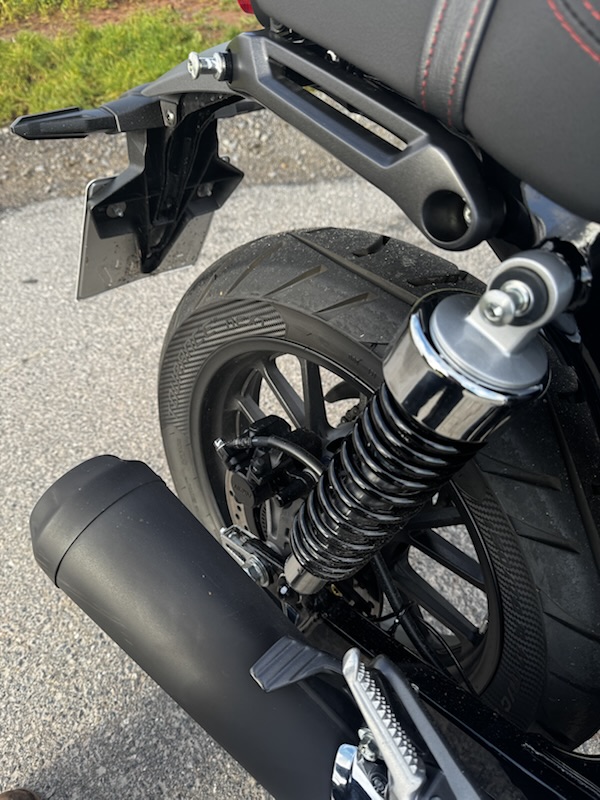 Das Fahrwerk ist simpel, aber gut. 41er Teleskopgabel vorne, zwei Federbeine hinten. Keine Hightech-Spielereien, aber zuverlässig und angenehm. Die hintere Federvorspannung lässt sich anpassen, alles andere ist fix und das reicht auch. Die Dämpfung ist straff genug für Kurvenspaß, ohne das Alltagsthema zu vergessen. Die Bremsen arbeiten sauber, ABS, Traktionskontrolle und die Antihopping-Kupplung regeln unauffällig im Hintergrund. Besonders gerade im Herbst für die feuchten Straßen und Blätterteppiche ein echtes Sicherheitsplus.